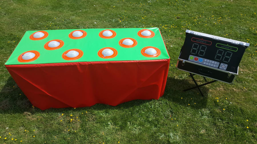 Our interactive play system is great fun for all ages, it consists of an interactive play table with 10 spots that light up red, green and blue. Where you can battle against each other in 3 different game scenarios in a race to hit more lights out than your opponents OR for the toddlers select 1 of 10 themes to set the lights flashing and activate sound, maybe a monkey or dolphin, a racing car or princess plenty of variety to keep them amused supplied all in a electronic score board system with digital counters, lights and sound.