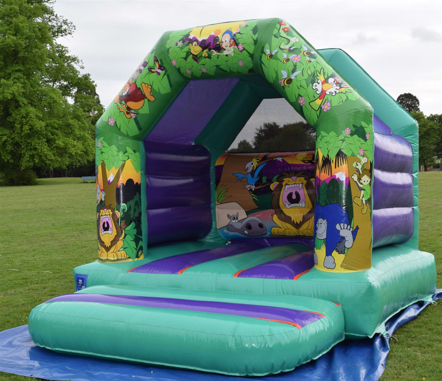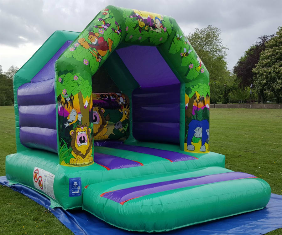 Let your children's imagination "Run Wild" with this brightly coloured Jungle themed bouncy castle. Featuring all the favourites from the animal kingdom, Lions, Monkeys, Giraffes, Parrots and more.