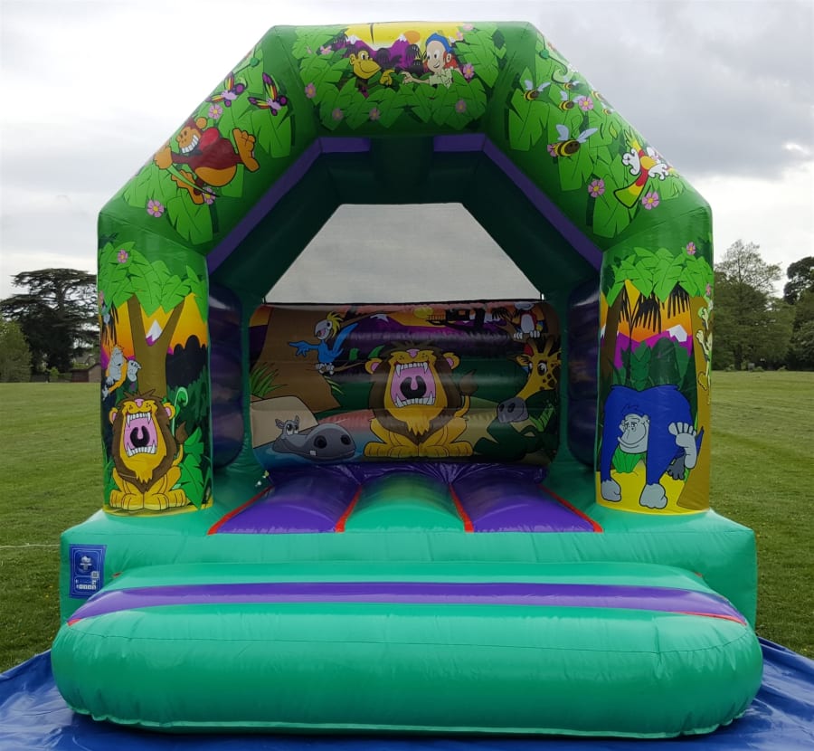 Let your children's imagination "Run Wild" with this brightly coloured Jungle themed bouncy castle. Featuring all the favourites from the animal kingdom, Lions, Monkeys, Giraffes, Parrots and more.